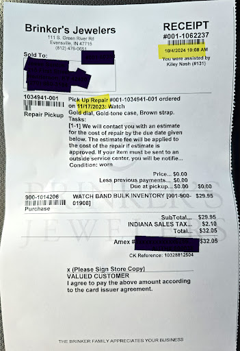 Brought watch in to get a repair estimate. Called me back said $250 to get it in working order. Waited a month said there was a delay on parts, should still get it six weeks. At six weeks said there still working on it. Six months later I just cold stop by and meet with management and the watch guy. They say they are having trouble getting it to keep time. I explain my disappointment to them saying, I gave you a blank check to repair the watch, what's the hold up? You guys do rolexes?!? I needed the watch for a special occasion that I already missed. I said I don't want to wait til October, due to another company engagement. The assured me I'd get it before then. Waited til Oct and picked it up. They cant find my watch for a while. Then, they say they were able to fix the watch, but didn't get ahold of me for whatever reason. They try to get me to pay the service fee and the new watch band. I told the lady didn't expect to pay anything, due to the circumstances. They waive the service fee and still make me pay for the new band. Day later the watch still doesn't keep time. I wasn't going to write a bad review due to waiving the service fee. But poor repair and customer service made me do it. Nice store, was looking forward to building a relationship with them. I guess I'll have to go elsewhere. Check the dates on the photo I posted. 100% true, almost a year. You figured they would try to right their wrongs in some kind of way. If it's quick and easy they might be able to help you. Any degree of difficulty, good luck. I'm sure they are going to follow this post up with some apology, like they care. But actions keep louder than words. It's easy to write a apology to save public face. Be wary, genuine action would be DOING SOMETHING.
