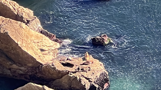 There is a little space to pull over your car and walk down the stairs to view the seal lions below on the rocks. It's too far away for a clear view with naked eyes. I could see only 2 sea lions with a binocular. There is a bench to spend some time admiring the view. But I didn't see any trail going down. Maybe it was temporarily closed.