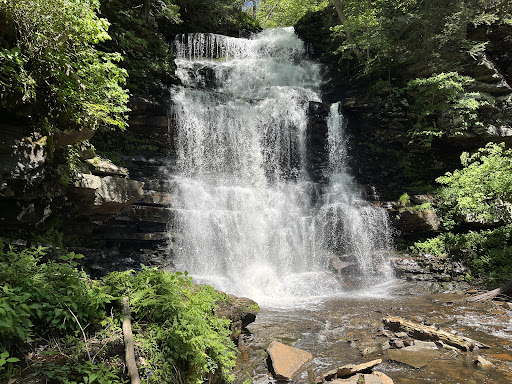 This 94 foot waterfall, named for âwater on the mountain,â is something else- the tallest of all the falls in Ricketts Glen. If you start in the highland trail and loop around the far side past Ricketts falls and down to the three below the loop, and then ascend the second leg of the loop, it kind of helps build the excitement for Ganoga. My kidsâ are pretty fast and busy, but by the time they made it to that last stairway up along the right side of Ganoga, it made them feel like they had almost made a summit (same idea, a building up of anticipation)- I would definitely want to do it that way and not start the descent on that side. The magical mist was perfect today blowing off the power of cascading water; we had started to build up some sweat and as we descended to the pools of Ganoga, the breeze and mist cooled us off fantastically and welcomingly. I would caution potential hikers on slippery rocks, inclines, and stamina for the trail- if you take it slow I think it is very doable but it is remoteâŚI started to receive satellite reception next to Ganoga and lost it by the time we reached the top, so, as a mom with four I was a little anxious of the proximity of edges and wet rocks and communication issues should needs arise- not to deter anyone but to think before you start- good shoes, water and first aid kitsâşď¸ beautiful experience - I would definitely go in spring and not wait for summer conditions - the water benefits from winter runoff providing a more robust waterfall in comparison to July-august weather conditions-part of the Ricketts Glen State Park waterfallsâŚour family has paid dozens of admission fees to see waterfalls that, after walking this loop seem like kiddy pools after swimming the English ChannelâŚ.start here if you live on the East Coast for waterfall exploration-PA State Parks have no admission so...