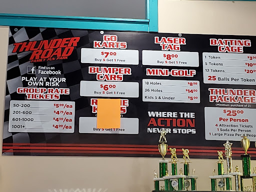 Thunder Road is a fun, relaxing place for some entertainment in Fargo. It's family oriented so no alcohol is served, but they do have a snack bar & offer bottled beverages. We played the first 18 hole course of mini golf. There's also a second 18 hole course that we did not play. The holes surround a large volcano structure with water running out of it that becomes streams going through some of the holes. The golf course is of the natural themed variety, no windmills or other out of place obstacles, just rocks & water. The course is fairly well maintained, although there are spots were the greens seem unintentionally bumpy & uneven. The challenge is average or a little on the easy side for most holes. In addition to mini golf Thunder Road also offers batting cages, go carts, laser tag & a video game area that's mainly geared towards children with a lot of coupon redemption type games, but some shooters or racing style games for older kids or adults. Prices seem to be the about average for this type of place in my experience. 18 holes of mini golf for two people was $13 & the one video game we played was...