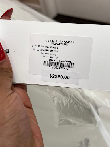 While my sister was getting dressed in the back, Natalie told us she would take the dress in the front and bag it for us. which at that time they peeled the price tag off so when we went to pay for the dress, the price was not on the dress any more.