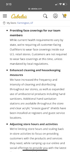 I am a Cabela’s club member, and today my wife and kids and I went in to spend over $200 in Cabela’s Club Points and my Christmas gift cards at the Farmington, Utah location. We have to wear mask to protect my wife against COVID because my wife has pre-existing medical conditions. I don’t mind if other people wear a mask, I think that is their choice, and I’m not interested in the politics of it. But the two employees at the Cabela’s Club signup booth ignored and the mocked us when we walked by them with our mask on. I know this because we could hear them talking about our masks which was none of their business frankly. I told my wife let’s just get our snow boots that we wanted and then we would just not come back to this location. Then we went to the shoe department and started shopping, we talked to a very nice customer their who suggested some nice boots he liked. Curtis was the clerk in the department, we were there for 26 minutes while Curtis greeted every customer around us except us, finally I said “excuse me could I get some help with some boots?” And Curtis ignored me and went on to greet and help the gentleman right next to us. My wife thought the best of the situation and thought that it might just be some confusion and asked Curtis for help and he walked right by her and greeted a new customer again while ignoring us. Finally I decided we were just going to leave and I would come back later by myself to spend the points. Then as we walked past the fishing department an employee walked by and said “nice masks” to us. My kids were with me for goodness sake. You wanna mock me that’s fine, but we were just trying to keep my wife safe while we shopped. This made me think to look into Cabela’s mask policy, I never cared before but clearly this location has strong feelings about it, and the Cabela’s website states that all store employees are supposed to wear masks. No one at this location was wearing one. I welcome the Cabela’s team at this location to please review the security tape from 12:45pm to 1:20pm if they don’t believe it. You can see Curtis speaking to everyone else and not us in the shoe department. I will be bringing this to the attention of the appropriate people and organizations to bring some awareness to Cabela and this locations feelings about the treatment of their customers and how they do not follow the safety guidelines that their own company advertises. I will be canceling my Cabela’s Card silver card and taking all my hunting and outdoor business elsewhere.