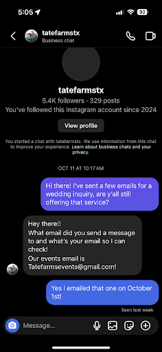 Read moreCame to this place for my wedding day & communicate with the lady prior that my WHOLE WEDDING PARTY was going to come take pictures here. She yelled at me (the bride) & told me to get off her property because I didn't let her know that the whole wedding party was going to be there which was not true because we spoke on the phone and I told her everyone was going to there & she said no only the bride and groom. She constantly rushed me off the phone as well and just said I got you down for the date you can just come. Sent me the invoice a week before the wedding and never let me know when the card was ran. I wouldn't recommend this place to anyone. The woman is so rude!! Who yells at a bride on her...