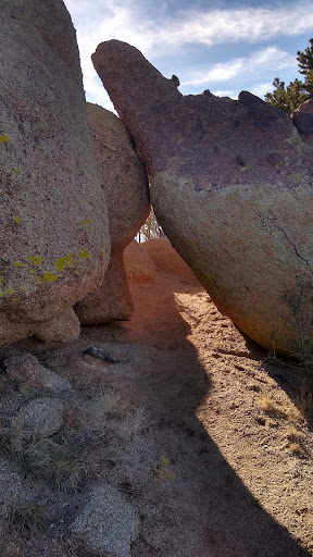 You'll know you're headed the right direction when you're headed north through a patch of boulders. You will stoop down a bit to follow the trail through an arch formed by two boulders, then head ESE to a saddle.