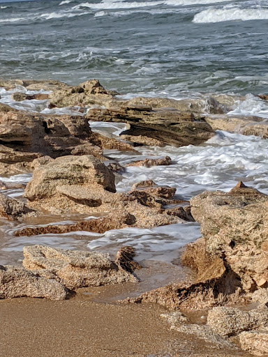 Read moreToday was rough, but when the tide is lower, the coquina is more exposed for tidal pool exploration. Lots of sea shells, some drift wood pieces, a few pieces of sea glass, and crab claws were among today's finds. A quiet beach. Walking is challenging due to soft, sloped beach. There is paved parking, restrooms, and shower with a slated walkway down to the beach. Not a good area for swimming due to all the rocks and coquina...