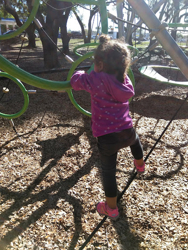 Read moreIts a nice, modern playground with beautiful old oaks- a couple of which can be climbed. Although there is equipment for ages 2+, the obstacle course style climbing ropes and (far too tempting) equipment for older children is integrated with the small toddler area 😔 so naturally the bravest of tiny people end up 10+ feet in the air forcing mommy to climb ropes and hang on for dear life to retrieve aforementioned fearless baby, while he tries to go higher and jump off like the big kids. (I understand and uphold my responsibility to redirect and correct him, however at 2yrs old he doesnt exactly understand why he isn't allowed on this half of the structure while the other children are.) Also, it can be VERY crowded afternoons and weekends. I usually avoid it because its the opposite of calming or relaxing which is something I look forward to for myself when I take the little...