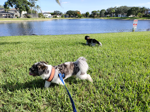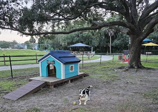 Beautiful park. The dog park is awesome completely shaded by huge trees. There is a really nice trail all the way around the little bodies of water surrounding the place. There is a cute playground for kids. Tons of shade trees. There is a dog wash station. Talk nice dog toys and balls and cute places for them to play.. fire hydrants. Bridges. Tunnels. Dog houses. Really stout chairs for people to sit in. There is a really nice setup here a large dog and small dog side with a really big meeting area and tree surrounded by a huge circling bench. Everything here is really nicely manicured and gorgeous. Everyone was super nice. They even have actual bathrooms. Someone put a lot of thought into this place! It's amazing. My old pup and my young pup equally loved it! Thank you.