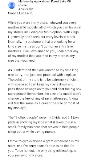 You mentioned in your response that I was shown the $275 mattress — however, you specifically told us that you did not have the $275 king mattress in stock, and instead offered the twin version to lay on. The entire reason for visiting in person was to try out the exact mattress being advertised — in the size we were interested in purchasing — not a smaller version of it.