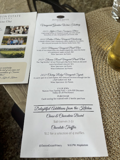 Read moreWe were lucky enough to have had a break in the weather to spend a beautiful spring day at one of our local favorites, Dutton Estate. We made an appointment for 2pm with ease. We were immediately welcomed in the tasting room where we were greeted with Dutton Cider by our host. Next we went to a wonderful flight of wines outside with an excellently prepared pairing with cheese and charcuterie. We had so much fun with other guests and staff. We picked some of our favorite wines like Thomas Road Pinot Noir and Kyndall’s Chard. The tasting room is always open and cozy, so much more local home feel. We are reminded by our laughs and cheer that we don’t...