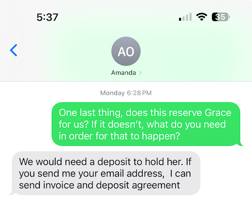 We recently tried a horse for my teen daughter, and it seemed like a great fit. The trial was on a Saturday, so we couldn’t schedule the pre-purchase exam (PPE) until the following week. Unfortunately, we had an unexpected death in the family. With everything going on, I asked Amanda if we could push the PPE to the next Monday and what was needed to hold the horse in the meantime. She said a deposit would be sufficient (see attached text). No problem-we sent it right away. We were serious buyers, and my daughter really liked the horse. The next morning, I received what Amanda called a “deposit agreement,” but what she actually sent was a purchase agreement. It was completely blank and stated the deposit was non-refundable and only transferable to another horse if the original horse didn’t pass the PPE-and even that was entirely at her discretion. In other words, it put all the risk on us and locked us into buying from her or forfeiting the deposit. I told her we weren’t willing to sign a buyer’s agreement before the PPE. She replied that she’d refund the deposit and if the horse was still available Monday we could get her vetted for her already scheduled appointment. She sold the horse a couple days later to another buyer, breaking my daughter’s heart. The contract she sent even encourages buyers to get a PPE before signing. It’s clear she uses deposits tied to purchase contracts as a tactic to pressure buyers into committing before they’ve had a fair chance to evaluate the horse. It’s dishonest and absolutely shady. Proceed with...