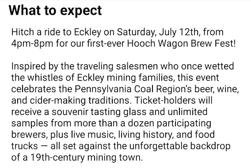 Read moreWe love visiting Eckley and have been here multiple times. Just to visit and for events. Today was their first ever Hooch Wagon Brew Fest. We purchased two tickets for a little over $80 with fees. We arrived at opening at checked in, showed our ID's and were given wrist bands. The woman at the table started to hand us small plastic cup. We said we were supposed to receive actual glasses. The other lady said there wasn't anything 'special' on our tickets to receive the small tasting glass. Not sure why there would be when you read what they posted. Another lady scanned our tickets - again. According to all of the Eckley posts (photo attached) you were to receive a tasting glass as long as you purchased tickets ahead of time, which we did. Finally after back and forth between 4 different women we were given the small glass. It was a hastle and didn't need to be. The two older women didn't want to give them to us, but eventually did with hesitation. That was definitely not a good start to the event. We feel that everyone going should receive the small glass, especially when paying over $40 per ticket. There were probably a dozen breweries/wineries. Two food trucks and one table selling cookies. We were familiar with most of the breweries and were surprised there weren't more involved. We have a lot of great local-ish breweries. I understand it's their first time having this event. We would attend again if there's not the hastle with the glass and if there are more...