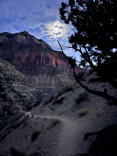 The last 5 miles was midnight to 3:24 AM with 4380 feet of elevation gain. I was tired. I was sleepy. I accidentally left my trekking poles at the north rim. I had chills. I was nauseated. I had to make myself drink the bitter, chlorinated water. The fresh horse manure on the trail did not help my nausea. Walk 200 feet and sit down. Walk 100 feet and rest. I immersed myself in the creek prior to the ascent. That helped a small amount. A few times I laid down on a rock and drifted to sleep. I used my light to look around the rocks for rattlesnakes or scorpions each time I sat down. I kept thinking that I wanted to call my friend and ask him to hike down to assist me out. I honestly did not know how I was going to make the last few miles.