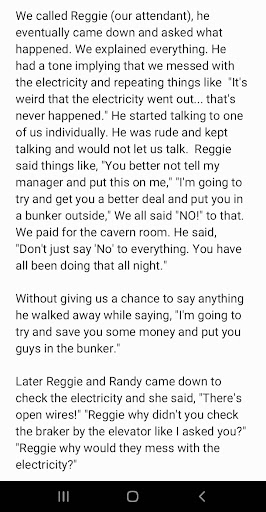 The real problems started the day we stayed at the cavern inn. I asked early in the day what time we could check in. Reggie, an employee, who was also our attendant for the night stay, told us around 2pm or 3pm. Later, we tried to check in at 2pm then they kept pushing the time back. I asked at 2:30pm then 3pm. Then a little after 3pm, Reggie tried to rush us into the room. He kept reiterating he had other stuff he had to do by 4pm.