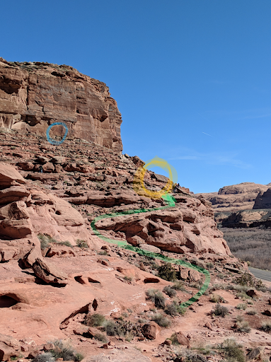 See my reference picture. Yellow circle is the slab with the dino tracks. Blue circle is the most prominent petroglyph of the people, but there are more along this wall. To the left of the blue circle is a slab with more...