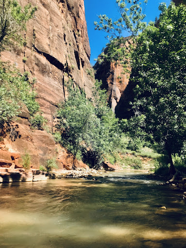 This is probably one of the easiest and nicest trails you will find in Zion. The trailhead starts out from the parking lot of the Temple of Sinawava and is the perfect starting point for one of the easiest and most scenic adventure trails you will find in Zion. The 2.2-mile round trip paved trail follows the Virgin River as it winds its way through a lush, verdant landscape of cottonwood trees, willows, and wildflowers. Make sure you keep an eye out for wildlife, including mule deer, peregrine falcons, and the occasional river otter. We were lucky to run into a herd of 12 mule deer after they just crossed the river to graze. This trail is suitable for hikers of all ages and abilities, so it will be perfect for families or those of us looking for a relaxing, easy-going experience. Along the paved trail, there are some historic sites, including the remains of an old river dam and the foundations of a 19th-century homestead. There are also a few benches along the trail to relax and enjoy the serene surroundings , like watching the river flow by. The paved portion of the trail ends at approximately 1.1 miles out at a paved raised patio. At this point, you will have reached the confluence of the Virgin River and the Zion Canyon Narrows, where the river disappears into the narrow, towering canyon walls. Most hikers will turn around at this point or for the more adventurous hikers, you can continue upstream into the Narrows themselves, wading through the river and exploring the stunning rock formations up close. FYI, make sure you are equipped for the journey. Regardless, we would recommend the first part of this journey to all wishing to enjoy the unforgettable natural beauty and tranquility of Zion National Park. Finally, the parking lot for this trailhead will be at the Temple of Sinawava when the shuttle bus service is not operating. There are also restrooms available near the parking lot (note: during our visit the restrooms were being renovated but they did have plenty of Porta...