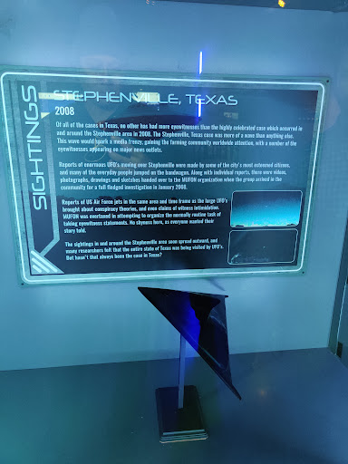 This was very disappointing for me. As a UFO enthusiast, I was looking forward to this since its only been open a month, my expectations were high. Possible spoiler Alerts First of all, the opening video was... ok but the audio was atrocious. There seemed to be 1 speaker overhead and it was very hard to hear. After that , there were some information plaques on the wall and a bunch of lights and gadgets that I thought would possibly light up and pinpoint a spot on the map where a sighting or abduction was reported but they did absolutely nothing, just turned on and off. Then getting to the bank of headphones that had 911 calls that you could "listen" to. I went through every headset, all had the same looped call but barely audible. I had to press the headset into my ears to barely hear so I gave up after about 30 seconds. The moon bounce was decent, some of the displays were intriguing. The "Feel the Alien Guts" part was really lame as well. All it was was green goo that stains your hands and clothes sitting on top of an alien. You couldn't open a rib cage or anything else and feel around for "organs" or nothing. It just sat on top of an open chest cavity. The... then "abduction" area. As you walk through floor to ceiling clear plastics hang downs, then there is an area about 10 feet across where you walk through them again. Nothing happens. I was expecting maybe a spotlight from above or an alien ship or something but no... nothing. I did enjoy the Ancient Alien section talking about the vimanas and those things. Then the "Shoot the Aliens" section... omg, your 3 year old will be bored with this after 3 shots. The guns are very high tech looking but the simulator is not. When you pull the trigger it gives you a 3 pattern light "blast" on the screen but nothing other than that happens. Just the lights and its the same pattern all the way across. The top half of the screen didn't even work. With todays technology, it seems like this could have been way better as well. Keep score, see how you did against other alien hunters for the day or whatever. Come on , this is a brand new facility did you consult with anyone or have a trial run on this before opening. All in all I was very disappointed with most of the exhibit and would not recommend this to anyone else. It seems like a lot of opportunities for even being mediocre were lost throughout the entire exhibit. Go see the...
