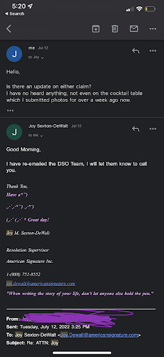 Read moreMy husband and I ordered furniture from American Signature in January- a queen sofa sleeper and matching loveseat. We were aware that because of COVID our expected delivery dates could change, and honestly that is not what I am upset about. I am upset by the complete and utter indifference with which we have been treated. Originally, our sofa was supposed to arrive in February and our loveseat in March. We received an email stating that the sofa would not be arriving until April, but we could still expect the loveseat in March. On the stated delivery day, I stayed home and waited for a call. I never heard from anyone and the loveseat was not delivered. The next day, I received a call letting me know the sofa was actually coming earlier than planned and would be arriving the end of March. When I asked what had happened to the loveseat, I was told it was delayed until April. I expressed the fact that I wasn’t made aware of this and had spent the entire day before waiting for it to arrive. There might have been an apology, I am not really sure. The sofa was delivered the end of March. When the delivery guys got the mattress out of the plastic wrap to put it in the sofa, I pointed out that it had a small stain on it. The delivery guy took a picture of it, and told me he would let American Signature know and I would probably hear from them in a few days about getting it replaced. This did not happen. Instead, I received a call several weeks later letting me know the loveseat was again going to be delayed. When I asked what was going on with the mattress, they did not know what I was talking about. I explained what had happened, and they told me they would send someone out to look at the mattress. After hanging up, I realized I didn’t need someone to come tell me that my mattress had a stain on it. I needed a new mattress. When I called to make this known, I was told I would need to speak with a manager. I left a message for Brian- the assistant manager- to call me. I did not receive a call back. The next day I called and asked for Brian. When I was told he wasn’t there, I asked to speak with the manager. I was told he was in a conference call and I asked to have him call me when he finished. He did not call me back, but a little while later I received a call from Natalie informing me that a new mattress would be delivered with the loveseat. Fast forward to today- I receive another call letting me know the loveseat won’t be coming until June. I am bummed. I ask if I could go ahead and have the new mattress delivered because I am having company over Memorial Day weekend. I am informed that I will have to pay to have the mattress delivered, or bring the old one to the store to make an exchange. This is when I had a rage black-out. I called and asked to speak to an assistant manager or manager. Of course, neither of them were there. Chris offered to leave a message, but I knew I would never get a call back. I was planning on just hanging up, but he let me speak to Ed, the sales manager. God bless Ed. He actually listened to my story and seemed to care, which literally no one else has since this whole thing started. He saw that my mattress will be arriving at the store on May 18th and promised he would either get it on a truck already headed to Murfreesboro or drive it to our house himself. If I could give just Ed five stars, I would. At this point, if we ever get a loveseat, I will be really surprised. I am really hoping Ed comes through for me with that...
