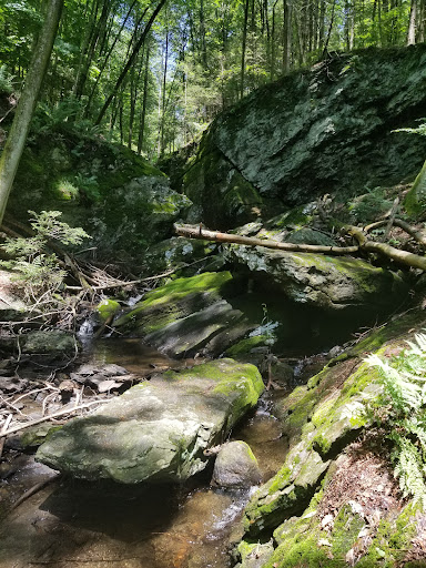 The path continues North, gradually descending, and meeting up with the long path you might have chosen from the parking area. Soon you'll be walking along a high cliff that forms the west bank of the small river named Bailey Brook. there's a good variety of microbiomes, small swampy areas that are vernal pools in season, little pine groves, and rocky grottoes filled with a variety of ferns.