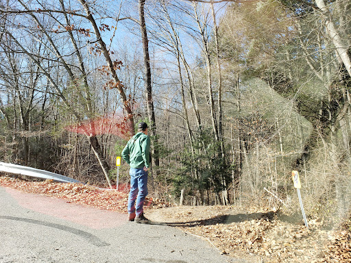 On the east side of the river, the trail turns south again and mirrors the opposing side, at first sticking close to the bank, then eventually gaining altitude until you are walking on a cliff along the river. The path splits, one choice heading east-southeast, higher up the hills into laurel woods. The main path follows the river south to meet Ayer road, a short walk on the roadside from the...