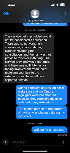 Roughly 2 months ago now I went in for a root touch up here, I was very specific that the blonde in my Ombre not be discolored because it had previously been colored matched to my extensions. On my color match, ombre transition and hair extensions I spent upwards of $500 to achieve this (not at this location). After my services here of roughly $175, my blonde hair was changed, no longer matching my extensions, I reached out and then they asked me to pay more money for another service and only to be ghosted after I explained the situation in a friendly manor to have my hair corrected. Throughout the inconveniences of money spent and not able to wear my extensions and Without an apology or response I’m just disappointed that I chose to give my business to this place. Will never return...