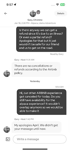 We were not offered any solutions or reschedule options by the business, and were instead told only of Airbnb’s policy of no refunds or cancellations. We followed up with hopes to book another time slot, our request wasn’t acknowledged until hours later when no recourse was possible, and again no solution was offered to us.