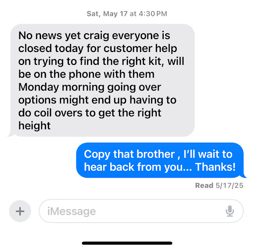 Approximately a month and a half ago, I contacted a local Tire Shop in my area to inquire about a lowering spring installation ,and they kindly explained they were unable to help me, but they recommended ā Les Schwabā⦠I had never heard of this business ,but I decided even though it was out of my area to give them a call to see if they could accommodate me. When I called, I was greeted at least at that time, respectfully by Shawn . I explained and shared my desire ,and he kindly said that day that they could accommodate me and they could do an install.He informed me that they only had available two options or two companies that they worked with , and that was it. I had no idea why, but I did not question my limitations on the only two brands of Springs they offered at the time. Shawn then told me he would either get back to me that day ,or it would have to be on the following Monday. Monday rolled around ,and I had not heard from him, so I decided to text his personal number he gave me. When I contacted him, he proceeded to tell me that he could not get a hold of customer support for some reason. I decided to be polite and give him the benefit of the doubt and give a few days to him, but still had not heard from him at all. I decided for myself to go visit the shop so he could take a look at what I needed. When I showed up at least that day, he seemed to be very courteous and we had a good conversation. We decided to measure my vehicle to see what would be a good fit for my car, and then left the shop. After leaving , I was excited to hear back from him so I could take care of the install. It took a couple of days and I still hadnāt heard back from Shawn , so I texted him and he said between the two companies that I was obligated to pick from that he could not find the correct springs ,and that I might have to choose coil- overs , which are much more expensive.On a Friday I believe, he mentioned that day that Customer Service was closed and he would have to get back to me on Monday. At this point , with limited choices I had which was a little odd to me and the lack of urgency to accommodate and help like I thought he was on a mission to do, I was very frustrated. Fo some reason , Shawn was so certain that a 2 inch drop would be too much which in my head I didnāt believe was true, but I was trying to be respectful.Come Monday , I not heard a darn thing and decided not to give Shawn my business whatsoever!