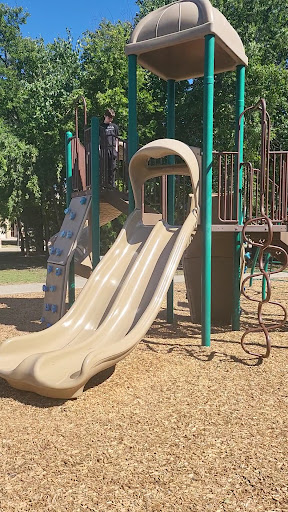 Lovely little park, perfect for our 4 and 2 year old grandbabies. The two year old needed help to be safe but he ran himself ragged! We walked to the bridge to catch a glimpse of the babbling brook....not much water there but downstream towards the school we we're treated to the sounds of the brook. It's a shame to see so much garbage there. We really enjoyed the park and there are some cool "art" pieces there as well. We always bring a kiddie potty for...