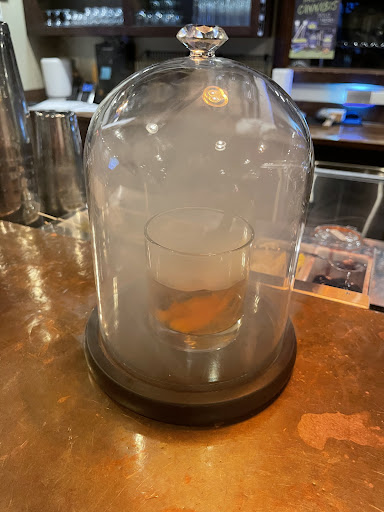 We sat at the bar and checked out an expansive menu of cocktails with fun names and creative ingredients. My husband ordered a barrel aged old fashioned, smoked. Emily did this impressive display of smoking the old fashioned using what looked like a cloche with a tube attached to it. At the end of the tube she placed oak shavings which she lit with a match.