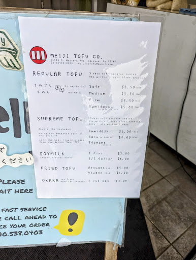 First discovered Meiji from a friend and their soy products are as good as you can get in LA. Our favorites are the zaru and supreme tofus. I often eat the zaru tofu as a dessert (just add your favorite maple syrup)! It is hard to go back to regular supermarket tofu once you've had Meiji's tofu. I have not found another place that has the same flavor and texture.