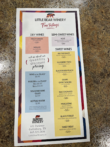 I can see that the winery’s response to my review is that they are happy that I had an amazing time. I would like to say that it is a exaggeration. It was not amazing. We got what we paid for. The tasting plastic glasses were as small as they come. So it is not like at wineries in California of France where you taste their wines in normal wine glasses. This place - as at the other wineries in town - let people taste (shot) 4-5 wines for free. And for about 5 USD you can taste 10-12 wines in very small plastic glasses. A tasting takes about 4-6 minutes and then you are out again. It was nice to also taste Little Bear Winery wines - but it was not an amazing experience - just good - and what was expected in Gatlinburg. No...