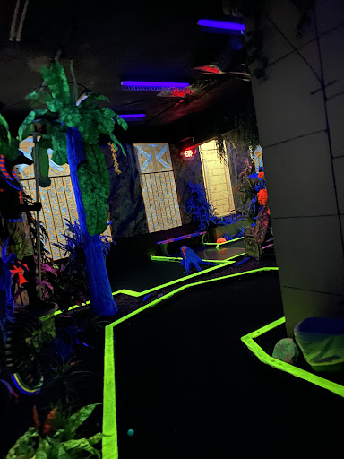 Played miniature golf here to be inside out of the heat. It was our first time playing here no need to go back. The guy taking the money with the long hair, is not a very chippy attentive welcoming employee. He could care less. when asked questions he was very short answered, he didn't care, was only concerned with what was on his phone when we entered and when we left. First I'll say. Find the treasure! There are about 8 or so things you try to secretly find to win a treasure at the end of the game. You go thru the course looking for things like a ring, gold, an earring. put which hole they are on. It doesn't explain just says closet hole. Is that closest numbered hole or closest actual hole?? Well of the 4 playing we had 2 cards and each card was different. When we left the first card was given to him, he said you won. I gave him my card he said you won. I said how?? the answers are different?? How? because he didn't even look at the cards! he just thru up a basket that was full of plastic Mardi gras beads and you take a 5 year olds plastic necklace. that's your winning?? searching inside for the treasure we figured surely a free game or something. SO don't even bother with finding the treasures. That's a joke! DId I mention he kept his eyes on his phone and head bend down over it the whole time while we talked to him? The course itself.. Simple no obstacles. Just straight shots with a short L shaped lane. Half the course is in black light. Half is lit regularly. It was air conditioned about all it has going for it. No need for us to return. No challenge here.. Hole lanes are very small and packed into a small building on top...