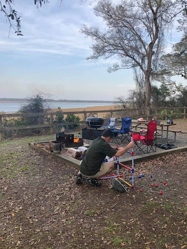 Stopped here 2 days on our way home. After paying $94.16 for two days online I had to pay another $3.75 on arrival for a 'pass.' Not much to do here. Would not spend more than a day here again unless you want to take a day trip out to the Okefenokee Swamp. Other than that, given the cost it's only worth an overnight. There are two sides, one is just a large open grass field with no privacy between sites. The other is wooded with some privacy. Most of the sites here are huge, some will take 3 rigs. Sites are just dirt/sand but were level. There is an area with some cabins, which are just small houses. We never did find the tent-area. Some walking paths, not many. There is a nice day use area with a playground. Restrooms/showers are single use. So, each bathroom has a shower in it. They are clean but spartan. The showers are prison-issue non-adjustable but good pressure, not too hard. Only 2 hooks and one tiny soap shelf. No curtain, just a jack-and-jill wall. Laundry is clean but requires an app, so we didn't do wash here. There is a put-put golf which is ok, needs a little love. There is a nature center, but it is hard to find, only one tiny sign at the roadside. The building has a sign labeling it but is covered with overgrown foliage. It was closed when we stopped by. Don't try to drive there, just walk to it. There isn't a parking lot there. The front office has a little gift shop with a few snacks and ice cream. They also rent bikes. We camped at Crooked River State Park in a...