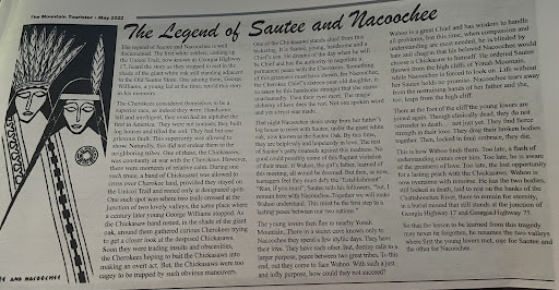 Here is a brief summary of the tale- The Chickasaw and Cherokees we're constantly at war with each other. During a moment of truce, the Chickasaw tribe was allowed to rest on Cherokee land. This is when Sautee, the son of the Chickasaw Chiefās meets and falls in love with Nacoochee, the daughter of the Cherokee Chief. Nacoochee's father, Chief Wahoo, instead of seeing this as a peace opportunity between the two tribes is blinded by hate and orders Sautee to be thrown off of the cliffs of Yonah Mountain. Nacoochee escapes her restraints and jumps after him. At the foot of the cliff, their fierce love allows them to embrace one last time and they perish...