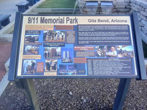 Read moreFor those of us who were involved with people in New York that day, this memorial was a surprise! Just seeing a small part of the building brings back a flood of memories of that event. I thought Gila Bend did a beautiful job in the design of the memorial and when you pass through this wonderful town, take a few minutes to stop at the 911 Memorial. Thank you to all who made...