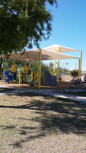 The highlight of the park is the playground which is pretty cool- it has a huge rope geometrical, kind of hexagonical climbing structure that extends over 10 (?) ft high...Next to the shaded playgrounds, there are some benches under trees, so you can have some shade while you rest or watch your kids play. There are also two ramadas, each covered with an interesting sloped triangular roof, and there are two picnic tables under each of them. Ramada areas were kept clean, and I saw they also had a bbq grill included. Other than that, the park itself is a bit small. It had a grassy field and you can see and hear the busy road traffic. Grass was dried out and there were no trails or restrooms. There was a singular concrete sidewalk that leads to the playground but nothing else to really walk on. Lastly, there is only...