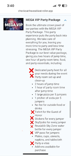 We did not receive: -Party host for all our needs -party room set up/ clean up -T-shirt for guest of honor -stickers for every jumper -resusable water bottles for every jumper -VIP Pass for every jumper party e-invites