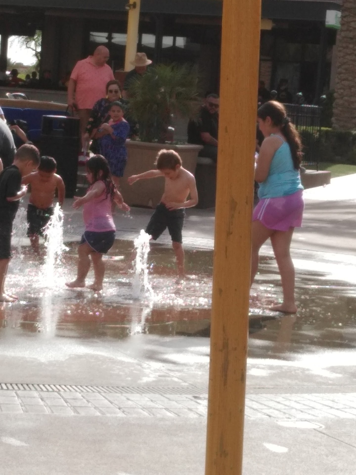 This is a really nice place to sit to have great Furniture outside you chilling I see the children running in and out of the water you just have to be careful sometimes in the water when I'm everybody's running in and out of it cuz sometimes the ground there each other money in and out of it sometimes you can get some kind of a skin disease from the ground so you have to be careful to make sure they wear some kind of water shoe in there but it is really nice to see all the stores around there and sitting there when there's a nice breeze over there it's a very pleasurable place to sit it's a very nice place to go shopping in awesome places to go is a great place over there called as you wish some marvelous ceramic place to have fun at with your...