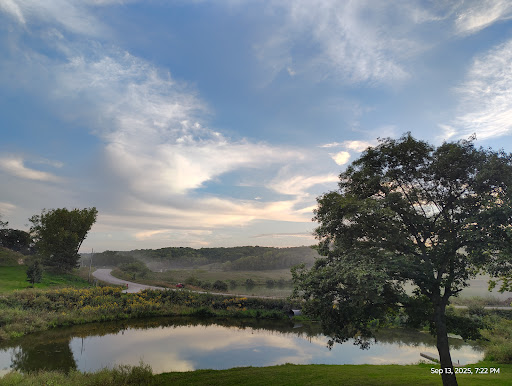 There is a kids play ground by the RV sites. There are several large grassy areas with pavillions. A walking path circles the park and that is a small interpretive trail on the south side. A pond that is in the park and a large lake that fishing and kayaking is allowed, no beach area. A total of 3 sets of vault toilets are around the park. A large conservation center sits at the entrance. The area is rather quiet, there is some distant noise of I-29 but it is hardly noticable. Very dog...