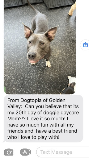 Ā Ā Ā Read moreI cannot stress enough how happy I am with my experience at Dogtopia Golden Valley. The initial tour was wonderful and everything was explained to me and laid out very nicely, including pricing. The first day that my dog Gigi went to Dogtopia she got a little report card after which I really appreciated! Gigi goes once a week and itās so much fun to be able to watch her on camera. The staff is extremely friendly and very welcoming. I feel great leaving her there and know that sheās always going to have a good time and be tired out at the end of the day! They also have add on services which saves me a lot of time as Iām not running all over town to get her groomed or a bath. Every so often they offer special days where they have special events for the dogs. The most recent being Motherās Day, where I was able to add a little Motherās Day present that Gigi āmadeā for me. It was a little dish towel that had Gigis footprints on it (which I now proudly have displayed in my kitchen!). Really fantastic facility and excellent people. The other thing that really surprised me is that when I bring Gigi home, she actually doesnāt smell like ādogā, which is surprising because she spent a whole day around many dogs! They really have it figured out here and I highly recommend Dogtopia! Picture below is of my girl on her first day there which was sent to me by the staff and greatly...