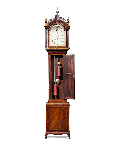 the cool clock in the photo in this is to the world famous Mr. Simon Willard Roxbury Tall Case Clock. Circa 1793. A brass plaque reads “Given by John Goddard as a wedding gift to his son Benjamin Goddard, M. Louisa May, 1793.” Dial signed “Simon Willard.”