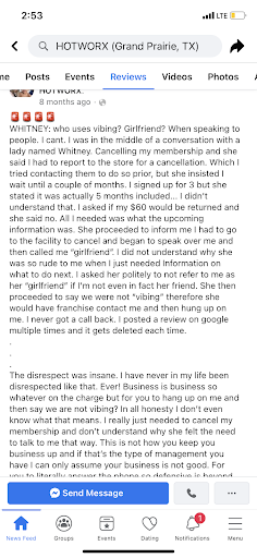 DONT SPEAK WITH THE MANAGER WHITNEY I've had a membership with Hotworx for many months and have only used it less than a handful of times and most times i didn't even show up to my scheduled time. I'm a single full time parent working 60-80 hour weeks with my infant son on my hip. zero help. I called within 30 days of my contract asking when is the earliest I can cancel. They told me the date. New mom brain I forgot to cancel. I called in and said "hey sorry I forgot to cancel but ill take the charge for this month and I will try my best to make it in to cancel" the manager then said oh no problem ill notate your account. Unfortunately I forgot again its very hard for me to find the time to make it in. I tried calling in asking for a refund for this month and that I would force myself to come in to sign sick baby or not. The manager Whitney continued to speak over me raising her voice over mine so I raised mine back saying "don't speak over me". she then laughed at me and said " ohhh haha you're frustrated!" very sarcastically. I went ahead and hung up I had a crying baby in the background and just didn't want to be treated like that. I went ahead and went to another location that is way closer to me and explained what happened and the manager there told me he was willing to help me out but he couldn't since it wasn't the location I signed up at even though I can work out at any location. They're privately owned franchise? The manager apologized and said he wished there was something he could do since I haven't even used the gym membership since the first 30 days of the contract but he went ahead and gave me Stephen Smith's email. Hopefully my situation will be resolved soon. I hope this location gets better management that's understanding like their...