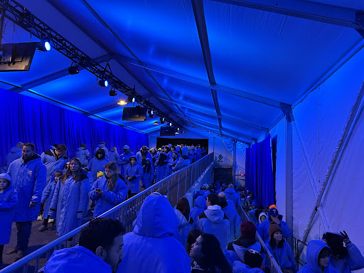 People funneled through a line to get a blue parka that had been worn by thousands of others. We skipped this because Iâm not into lice or communial diseases and no one said anything about us wearing orange and red in a sea of blue.