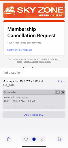 So here's an update. Some dude did call me back. Asked me how I tried to cancel. Evidently there's 3 ways to do that, corporat website, Sky Zone Greenville website, and on the membership confirmation email that I received, which is what I tried to do, because it was right there in front of me! He told me there was no record of my cancelation, although I attempted to do it twice. He said he would cancel for me, but refused to give me a refund. I told him that was a pitiful way to do business and he told me that I needed to check my tone. I said my tone fits your business model and you'll never see anyone from my family ever again and hung up on him, because I didn't agree with his tone either.