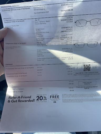 Read moreWorst experience ever! My son went in to purchase glasses. He was on a budget and was wanting to stick with the 2 for $59 deal that he saw advertised. Of course, the saleslady (Stacie according to the reciept) took him immediately to the more expensive frames. He told her he wanted to keep it cheap so she started handing him designer frames. He made himself more clear and told her he was only interested in the 2 for $59 and her attitude completely changed. She plucked the frames she had previously handed him out of his hand, and led him to the corner close to where he had previously been looking. She showed him two rows (not even full rows) and told him those were his options. These were brightly colored, extremely cheap looking frames. She also pointed out that the next three rows were $29 each. My son chose 2 frames from the $29 rows and said he could afford the difference. She then started adding all kinds of unnecessary features like tinting, polarizing, and other coatings, racking up the bill. My son finally lost his temper and told her he simply wanted to be able to see. He told her he didn't need any bells or whistles, he just wanted to have some plain old glasses. She tried to talk him into several things he didn't actually need and tried (successfully) to make him feel like the frames he chose were inadequate and not as good as the more expensive ones. I finally stepped in and asked my son (who is 17 by the way and wanted to pay for his own glasses) how much money he had. He told me $80 so I told Stacie that he wanted 2 pairs of glasses for under $80. She proceeded to tell us that the frames he chose were cheap with her nose turned up. I will never ever go back to Stanton and if anyone asks, I will make sure they know not to go there themselves. I realized that Stacie just wanted her commission but at the end of the day, you work in customer service, and you have no idea why my son was trying to stick to a budget. You are not a nice person and good salespeople don't make others feel like second class citizens simply because they don't want to spend a ton of money. Lining you pockets is not more important than common decency. Thank you for teaching my son how not to treat other people. I'll...