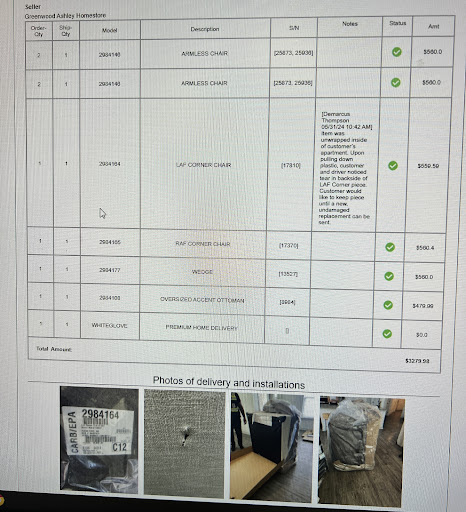 Updated review 6/11/24: My couch was delivered on 5/31 with a tear in the LAF corner. I asked the driver what the process was for replacing or repairing the couch and if it would go against the warranty I paid for. Several phone calls between myself and the driver and then myself and customer service ensued. They went back and forth with what options we had and they were never on the same page. I was told they could replace it with a new piece that day because they had 2 of the same piece at the DC. I was then told they could pick up the damaged piece and replace it in two weeks or I could wait for a “professional” to come out and repair the fabric so it would look brand new. I was told again that they would have someone come out and pick up the damaged section and replace it with a new one that same day. It’s 6/11 and I have yet to receive a call from someone. So I looked up the store hours and phone number and noticed they weren’t open at the time (9:40a) but there was an option to start a chat with someone. I decided to go that route thinking it would be easier. No, it was absolutely infuriating. The agent asked me to confirm one thing at a time and I had to wait several minutes between each question. I provided a screenshot of the order summary that detailed all of the information they asked me for, it also included pictures of the driver’s notes about the tear and photo…just to be asked questions that were answered by my screenshot. The chat agent told me she couldn’t see my order because it was placed at an “Ashley Partner Store”… I’m sorry but the name on the store says Ashley Homestore so I really don’t care who owns it or what it is… they should be able to assist. The agent advised me to call a number and I did so only to be put on hold by a robot, hung up on after waiting 5 minutes, then asked to take a survey on how well they assisted… I called the customer service number that had been calling me on the day of my delivery, had the same incident happen and got disconnected and asked to take a survey again. I told the chat agent that I wasn’t able to get through to anyone and she gave me the number to the store I ordered it from. I called that number and was immediately transferred to the call center. I told the agent I was expecting to speak to someone at the store I ordered the couch from and she advised that the store probably has their calls automatically routed to the call center (why??? It was after 10am at this point so they were not closed). The call center agent was brought up to speed on everything and I was told “I don’t know what that agent is talking about, they should be able to see your order.” After 20 additional minutes on hold I was told the recovery team would contact me with an update in 24-48 hours.