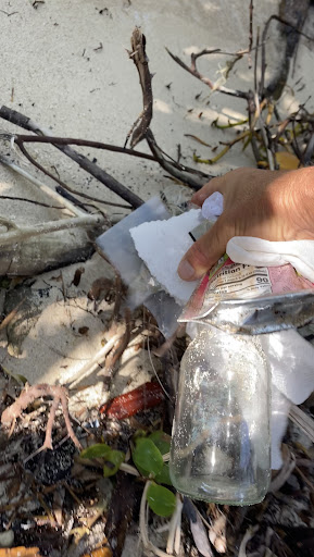 Garbage from beach goers welcomed us back to this remote, southern beach, including dirty diapers and used tampon dispensers, fishing line, styrofoam plates, plastic bags, cups, and bottles that blanket the mangroves and the grasses behind the parking area.