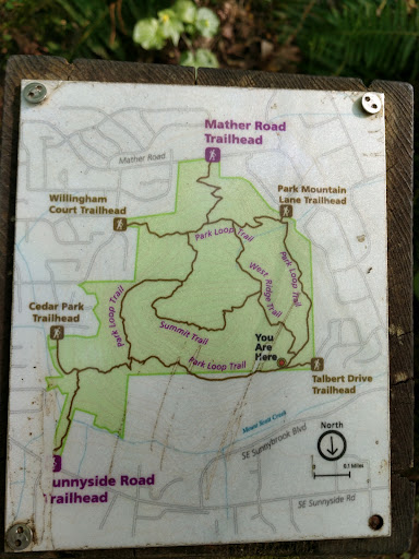 Read moreI started my hike at the Mather Road trailhead. The restrooms are currently closed and there was no map of trails that I could find. I took the Summit Trail to the top and found a number of tree roots and rocks to step over on the way. The forest is very thick with Douglas Firs and it difficult to see anything from the summit. I did a loop around the park and found open areas on very uneven rocky trails. A number of trail markers with maps helped me to find my way on Mt. Talbert. It was very peaceful hiking through the forest with the sounds of different birds. The trail to the top and the ridge had fewer people on it then the loop around the park. Located in Clackamas near the Kaiser Sunnyside Hospital. Mt. Talbett is a nice place for a hike with uneven rocky trails with tree roots to step over and...