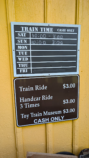 An outing for the train enthusiast of any age. Bring your cash. $3.00 for a train ride--all ages (infants free). For kids up to 52", $3 will get them a ride on a handcar--rail seat propelled by hand pedaling. $3 to go through the museum of toy train memorabilia and artifacts from local rail lines. Bring a picnic to enjoy in the shade and wave to the train riders. This local highlight has been around for 55+ years--the current proprietor helped lay the rails for the train ride when he was a teenager.