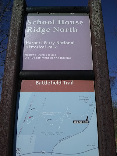 Part of Harpers Ferry National Historical Park. Not much shade on this battlefield walk to the Confederate cannon battery, so recommended in fall, winter, and spring. The ridge is a moderate to easy hike to get to the cannon battery. Walking and dog walking on a leash are popular on the trail. Birdwatching opportunities in the fields. Once at the cannon battery one can look across the road and see the woods of Bolivar Heights where the Union Cannon battery was in place defending Harpers Ferry. If a longer hike is desired one could add the trails on Lower and Upper Bolivar Heights which start across the street from the School Ridge North...