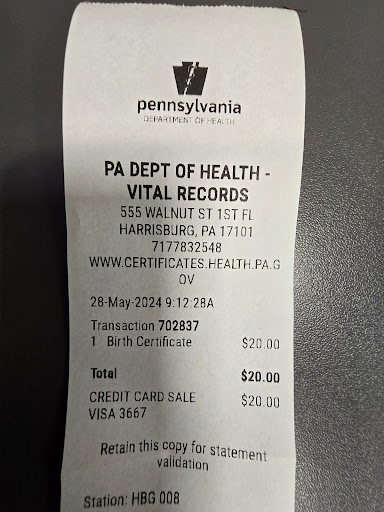 Read moreFirst i tried ordering online. Because i settlement on my house was 3 days later and the new address was not yet on my id they will not allow us postal service to transfer and my id address didnt match where i was having them sent. I needed them to start my kids in their new school district.i paid over 100 for the 3 bc plus rush it was suppose to be reimbursed never was. So I went to Philadelphia location last week of Aug and sat from when they opened until 12 in which i had to leave for work. I took the applications with me got a money order for the 3 of them(which was cashed in sept) it is now feb of the following year and i still dont have my 3 children's birth certificate. Also cant reach anyone to discuss this. Its ridiculous if you cant keep up on demand hire more employees you charge $30.00 for a piece of paper and a stamp!!!! This is a corrupt Government...